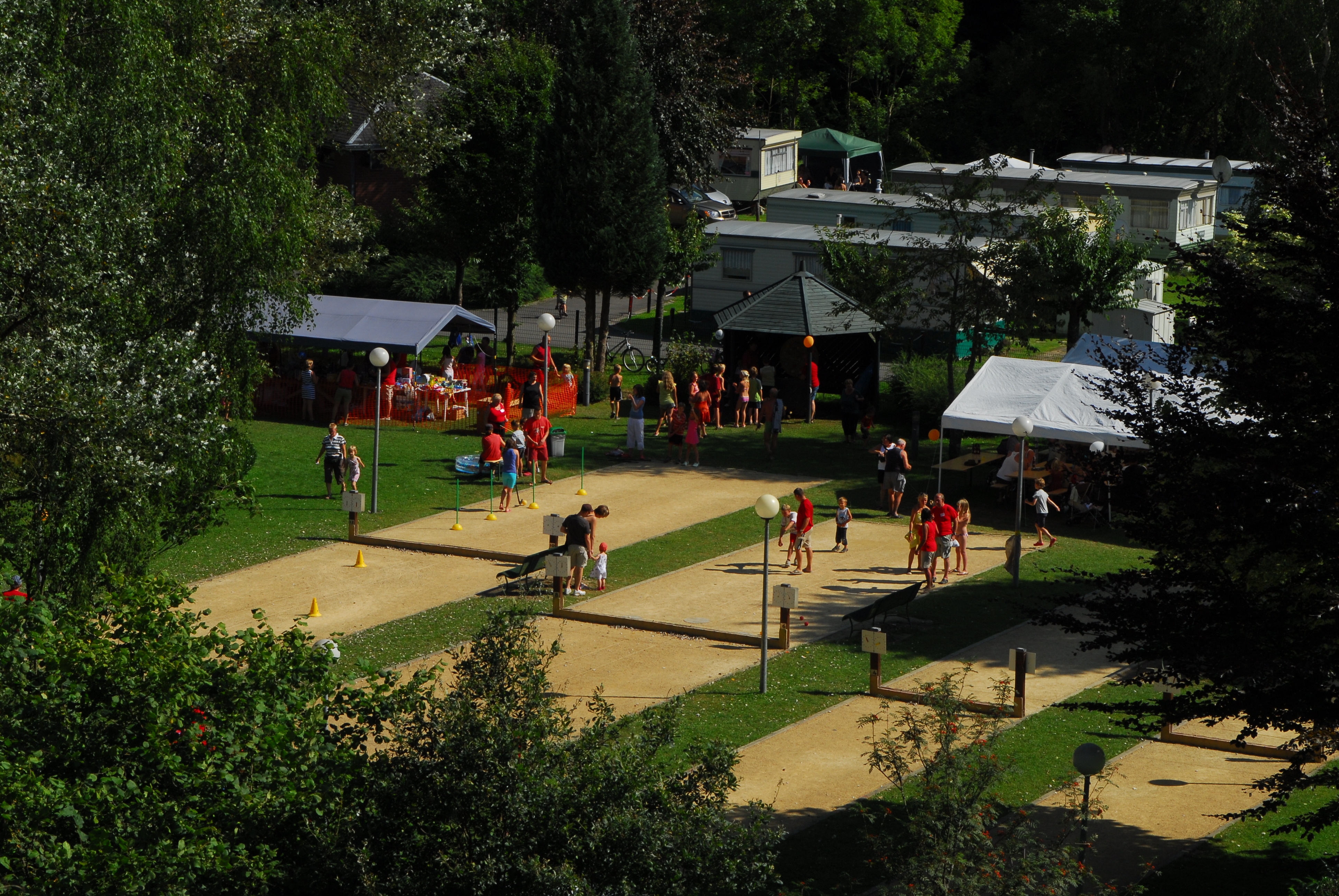 Situated on the banks of the Ourthe, you can cool down in the river, use the heated swimming pool (fee) that is a few minutes’ walk away from this picturesque campground. The Ourthe is also a popular spot for kayaking, canoeing and other watersports. Sports enthusiasts will also appreciate the campground’s sports field, volleyball court, table tennis tables, and bowling alley.