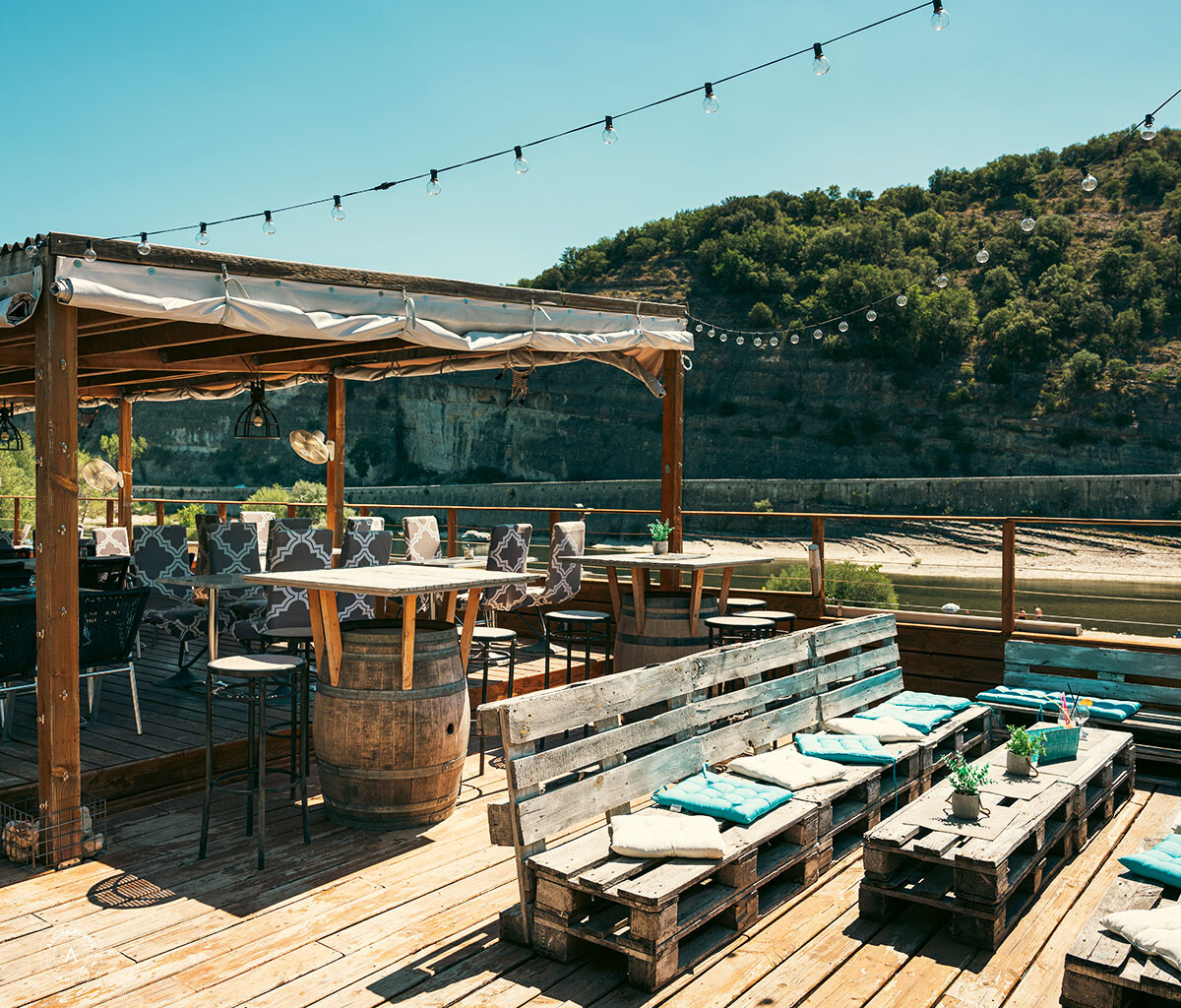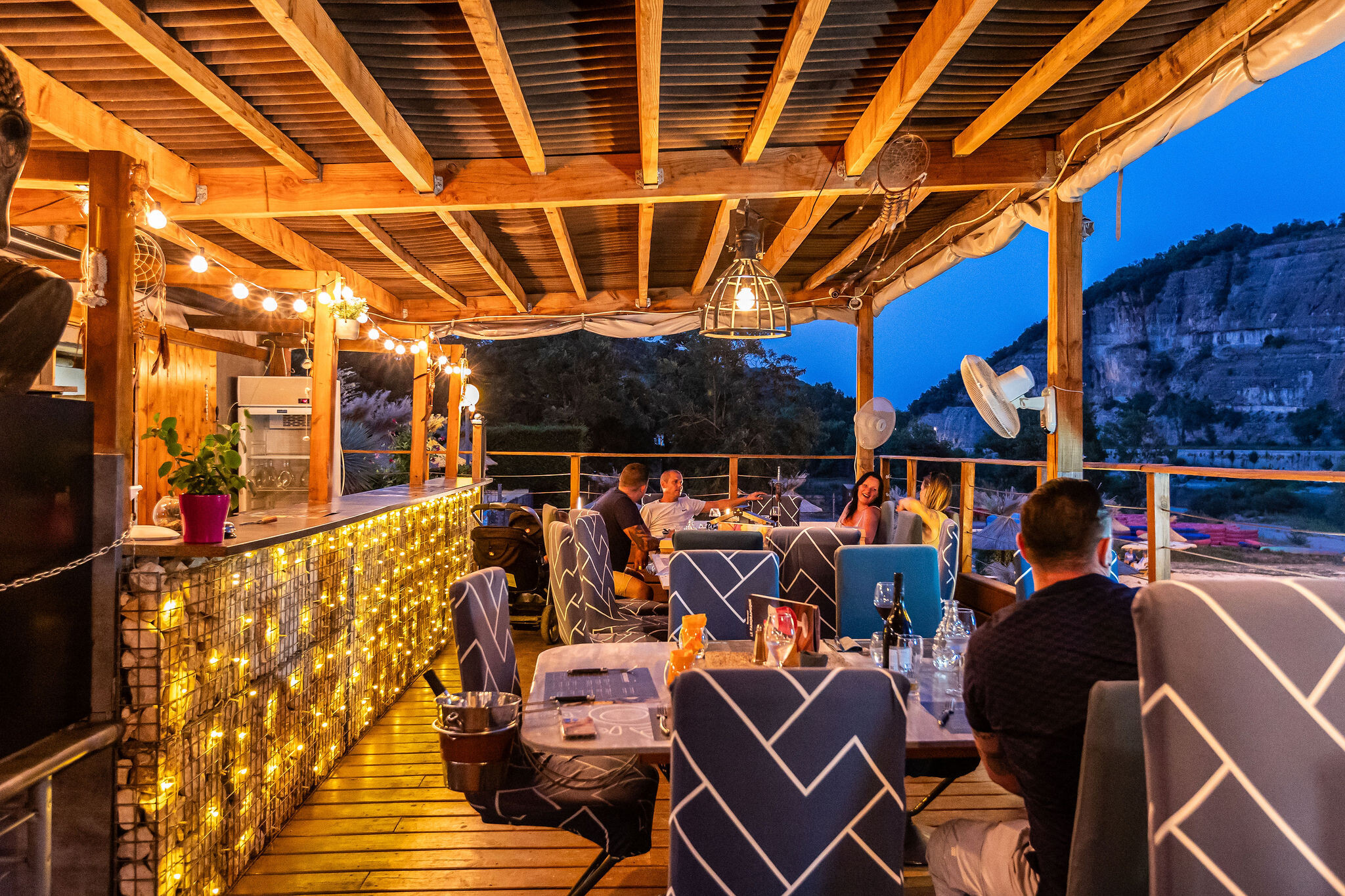 If you've been on the road all day, you'll settle on the campsite terrace at the end of the day. With a drink at hand, you can look out over the beach and the river. The terrace is very cosy, and if you get hungry, you can also enjoy a delicious meal here. Would you rather stay at the campsite for a day? Then you can join in with a game of petanque. The children play in the playground or at the entertainment, and in the evening everyone comes together for a fun theme evening on the terrace.